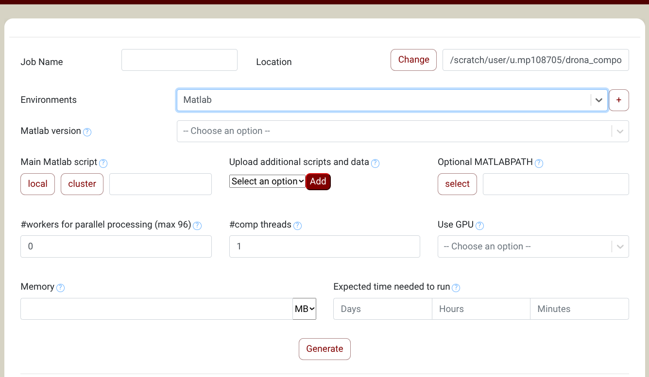 Drona Workflow Engine, developed by HPRC, provides a 100% graphical interface to generate and submit MATLAB jobs without the need to write a Slurm script yourself or even be aware of Slurm syntax and MATLAB internals. The Drona app is available on all HPRC Portals under the Jobs tab (Screenshot) .