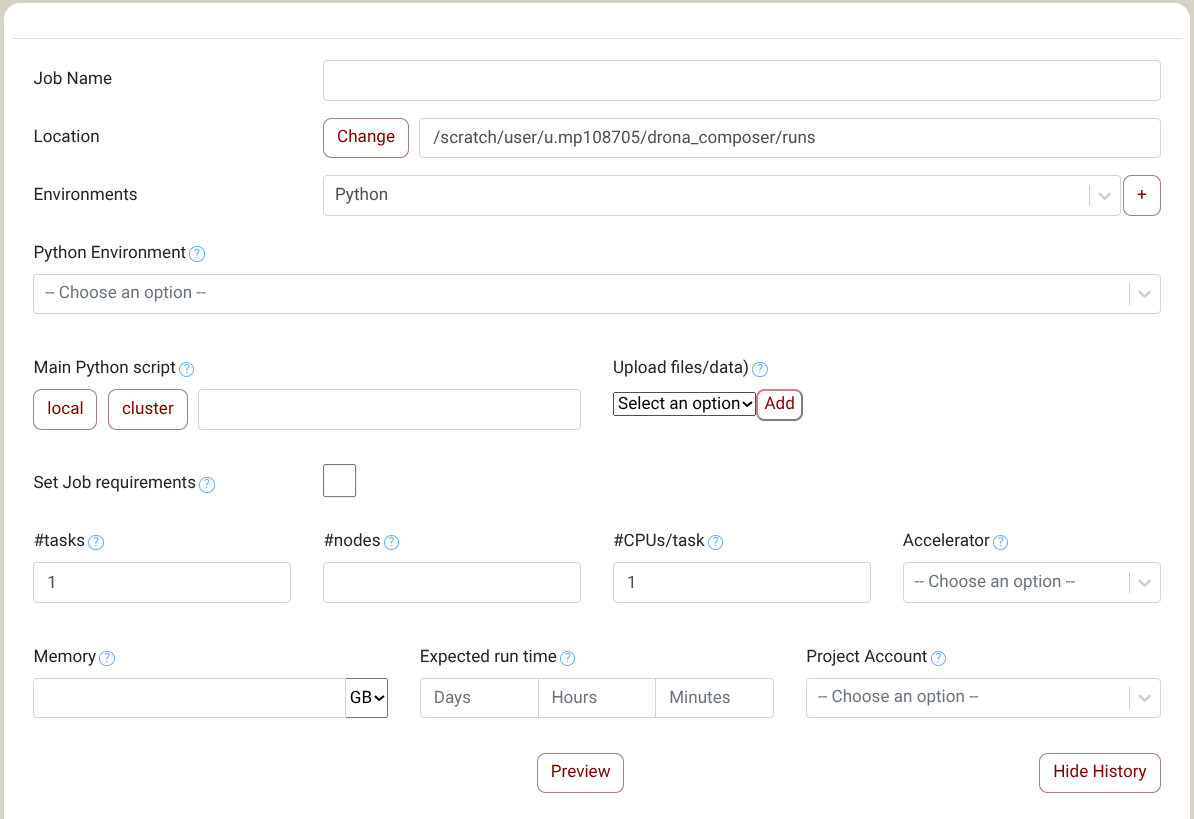 Drona Workflow Engine, developed by HPRC, provides a 100% graphical interface to generate and submit Python jobs without the need to write a Slurm script yourself or even be aware of Slurm syntax and Python internals. The Drona app is available on all HPRC Portals under the Jobs tab (Screenshot) .